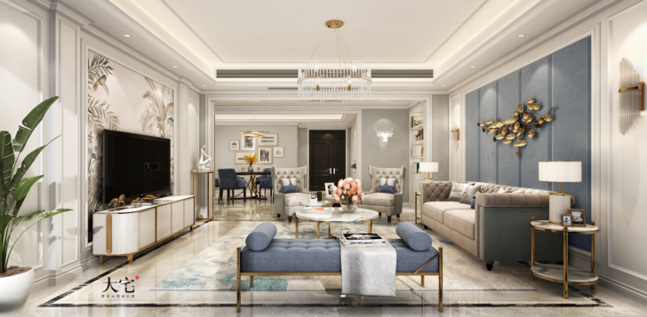 湘江壹號220平方米簡美風格案例效果圖-客廳