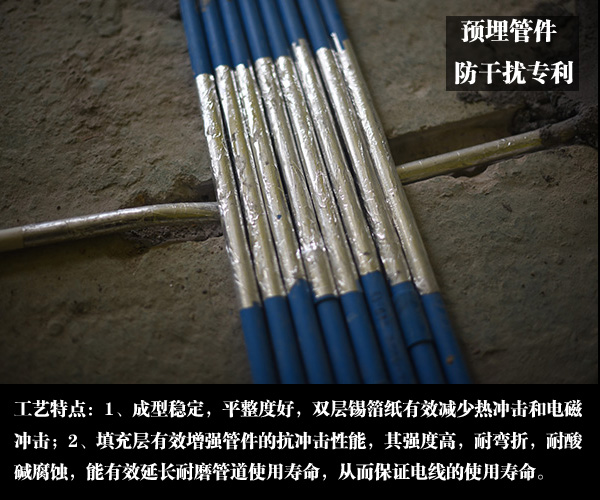 預(yù)埋管件防干擾專利實(shí)用新型成型穩(wěn)定,平整度好、利用雙層錫箔紙光潔度和熱反射性有效減少外界環(huán)境以及交叉管線對(duì)管道的熱沖擊和電磁沖擊,同時(shí),其內(nèi)填充的石英砂和CPVC支撐管能有效增強(qiáng)管件的抗沖擊性能,其強(qiáng)度高,耐彎折、耐酸堿腐蝕性能優(yōu)越,能有效延長(zhǎng)耐磨管道的使用壽命,進(jìn)而保證其管道內(nèi)纜線的使用壽命。