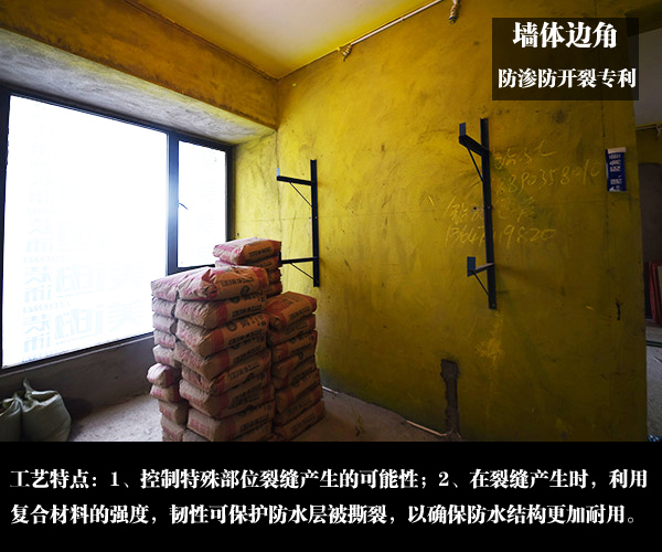 實(shí)用新型的防滲防開(kāi)裂墻體邊角結(jié)構(gòu)施工方便,周期較短,可在施工完成后對(duì)墻體邊角位置進(jìn)行包裹保護(hù),控制墻體邊角位置的裂縫產(chǎn)生的可能性,同時(shí)在裂縫產(chǎn)生時(shí)利用復(fù)合材料層進(jìn)行連帶加固保護(hù),復(fù)合材料層的韌性可保護(hù)防水層在較大強(qiáng)度下不被墻體裂縫撕裂,以確保防水結(jié)構(gòu)更加耐用。