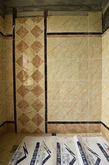 細節(jié):洗手間里已經貼好了瓷磚,衛(wèi)生間與水接觸最多,所以在衛(wèi)生間鋪磚,就必須重視防水和防潮。啞光面或者是帶有凹凸造型的瓷磚是最佳選擇,其目的是防滑。其次,還要注意衛(wèi)生間的地面應低于其他房間的地面10~20毫米。通常情況下衛(wèi)生間地磚的鋪設保留1%的漏水坡度,地漏處最低,以利于排水。地磚接縫要粗細一致,與墻磚縫對齊。