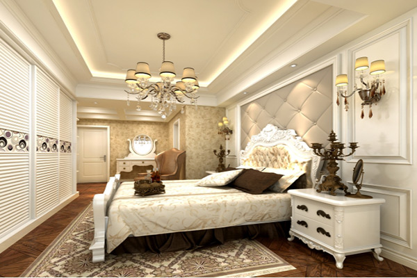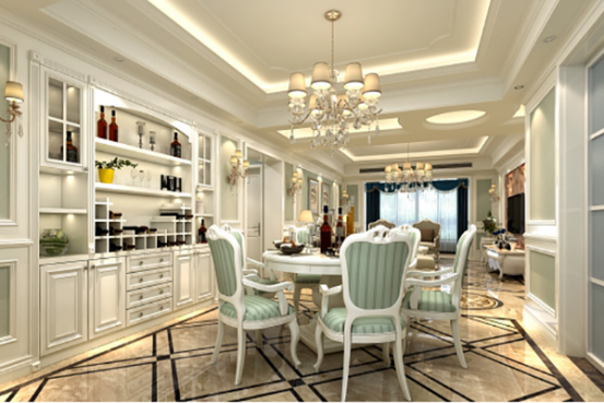 選材方面,除了歐式慣用的白色實木材質外,還使用了藝術壁紙、皮質軟包、水刀大理石拼花等現(xiàn)代材料,大大提升了原質感的對比效果,在表現(xiàn)尊貴的同