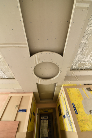 細節(jié):過道異性吊頂。七字行,就是像阿拉伯數(shù)字7一樣,橫豎有連筆成一體的樣式。七字行吊頂,就是在吊頂拐角處的兩個角,用一整張板材做成,這種結構可以最大程度保證吊頂結構穩(wěn)固,其表面的裝飾材料不易開裂,鼓起,脫落。